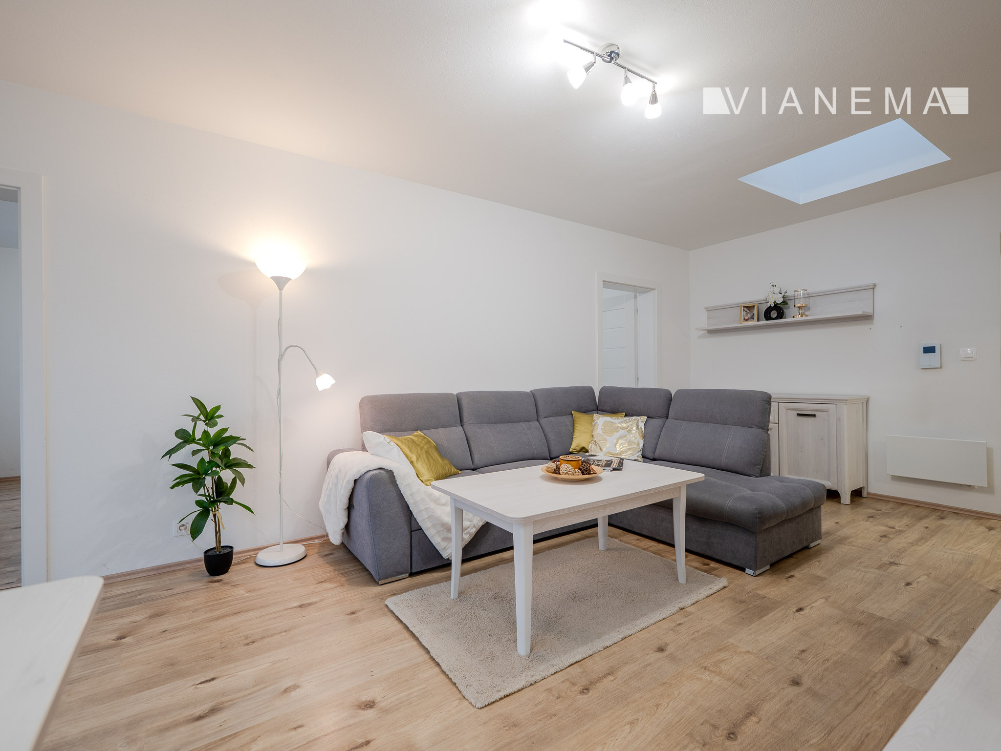 V obývacej izbe vás prekvapí strešný svetlík, ktorý do priestoru vnáša prirodzené denné svetlo a jedinečnú atmosféru. ☁️✨