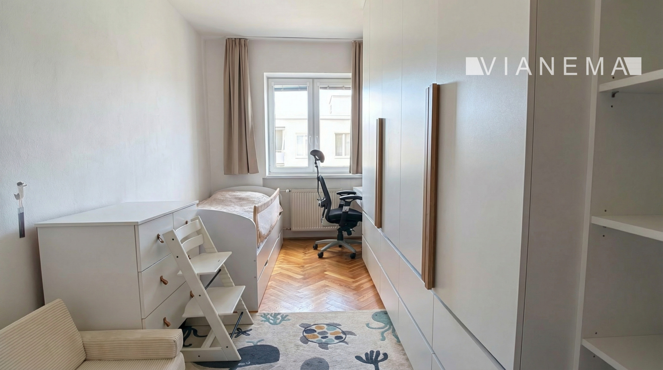 Interiér tohto bytu na Robotníckej ulici v Bratislave je príkladom praktického využitia priestoru. Byt prešiel kompletnou rekonštrukciou. Dubové podlahy v izbách, dodávajú interiéru teplý a príjemný pocit. Plastové okná so žalúziami zaisťujú optimálnu izoláciu a súkromie, zatiaľ čo zasklená loggia fínskeho systému poskytuje ďalší priestor na relaxáciu. Kuchyňa je kompletne vybavená a spojením s obývacou izbou vznikol svetlý a priestranný rodinný priestor, ideálny na spoločné chvíle. Vstavané skrine v chodbe a detskej izbe poskytujú dostatok úložného priestoru, pričom každá izba je navrhnutá na mieru pre maximálnu funkčnosť.