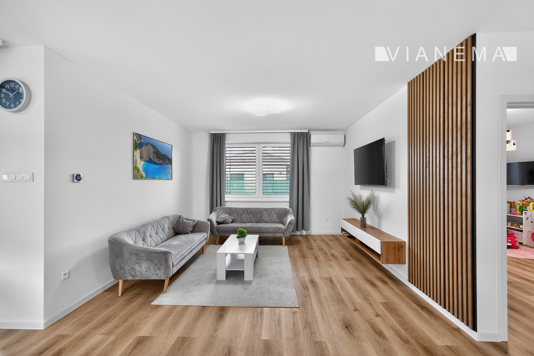 Dispozícia: Predsieň, šatník, technická miestnosť, samostatné WC, kúpeľňa (vaňa, sprchový kút, WC), detská izba, spálňa a priestranná obývacia izba prepojená s kuchyňou.
