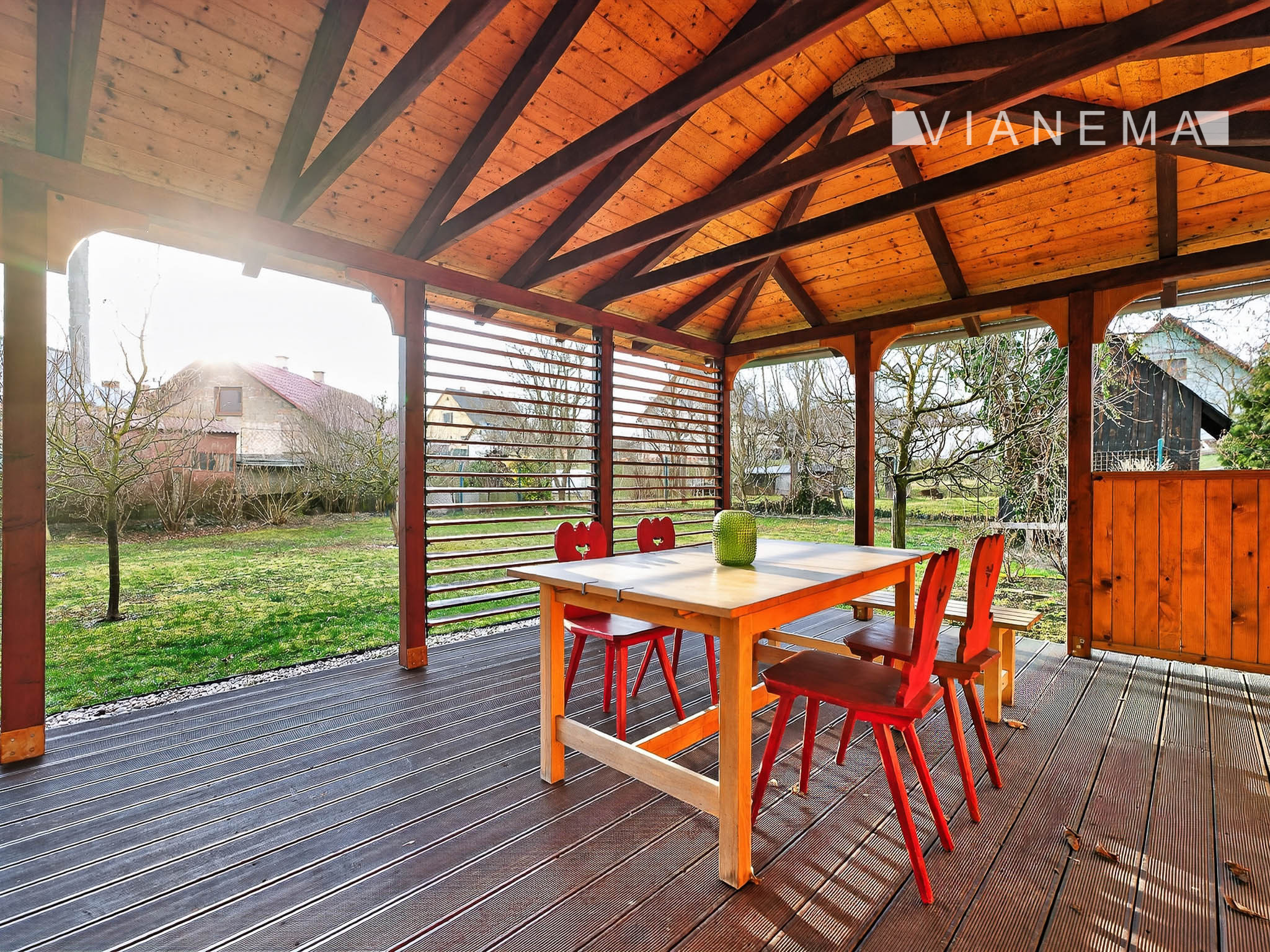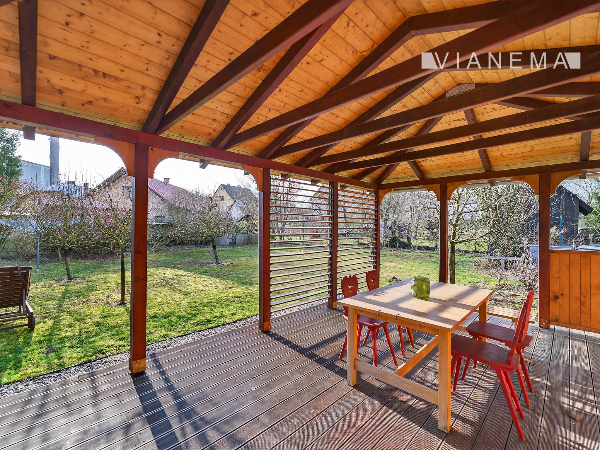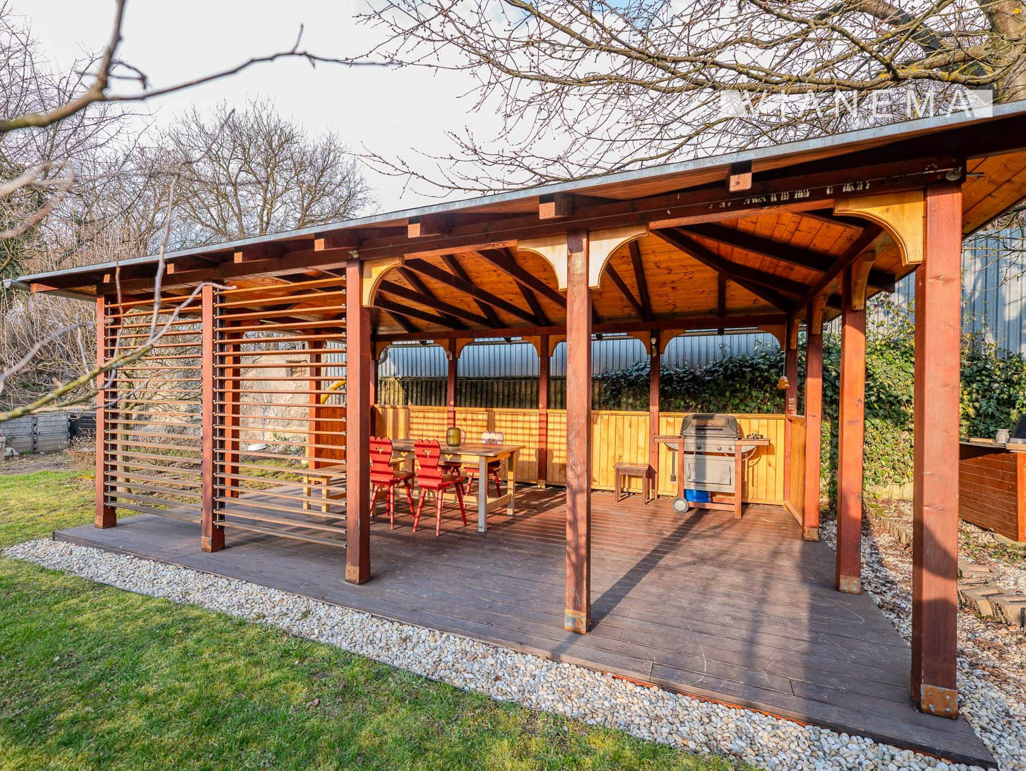 Priestranný drevený altán je ideálny pre relax, vonkajšiu kanceláriu alebo na stretnutia s rodinou a priateľmi.