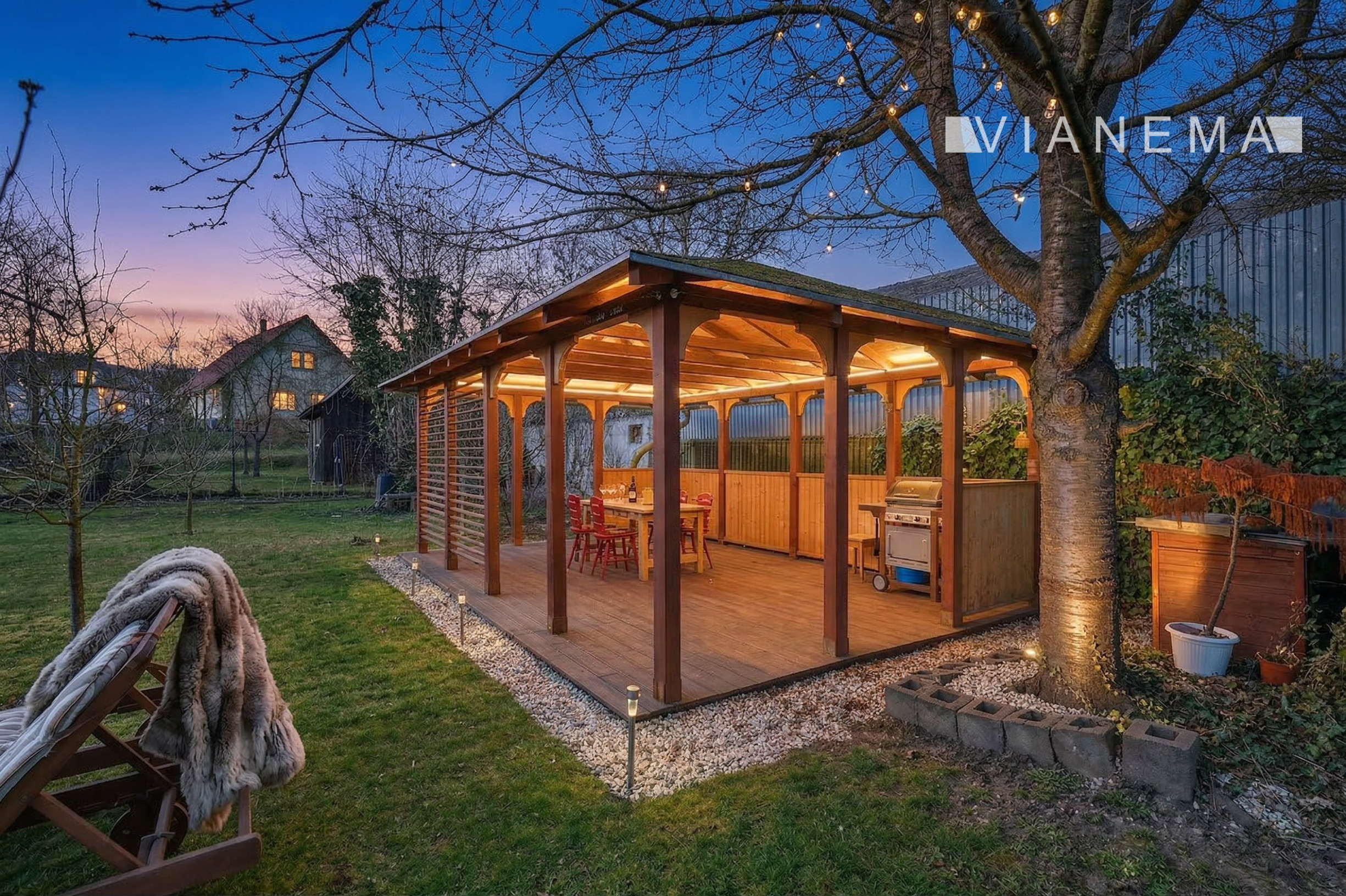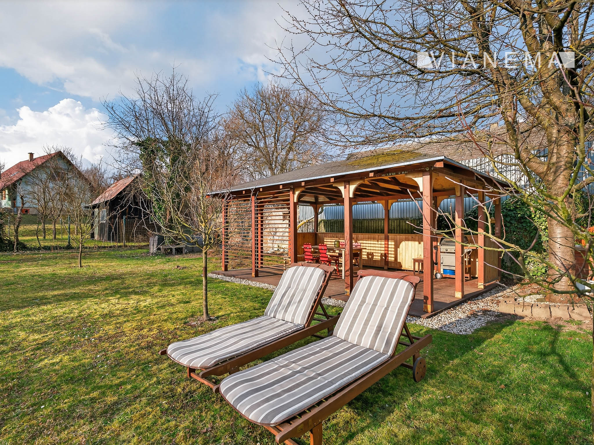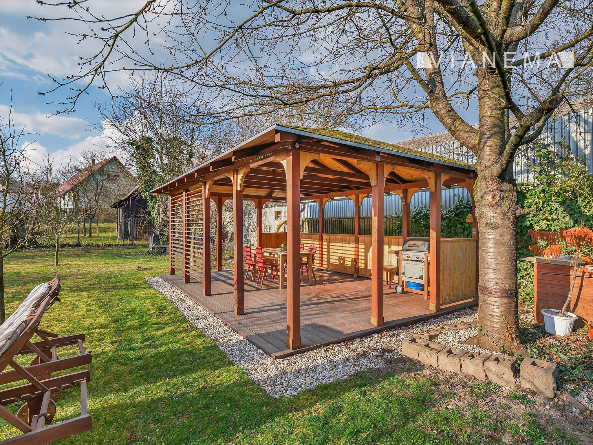 Priestranný drevený altán je ideálny pre relax, vonkajšiu kanceláriu alebo na stretnutia s rodinou a priateľmi.