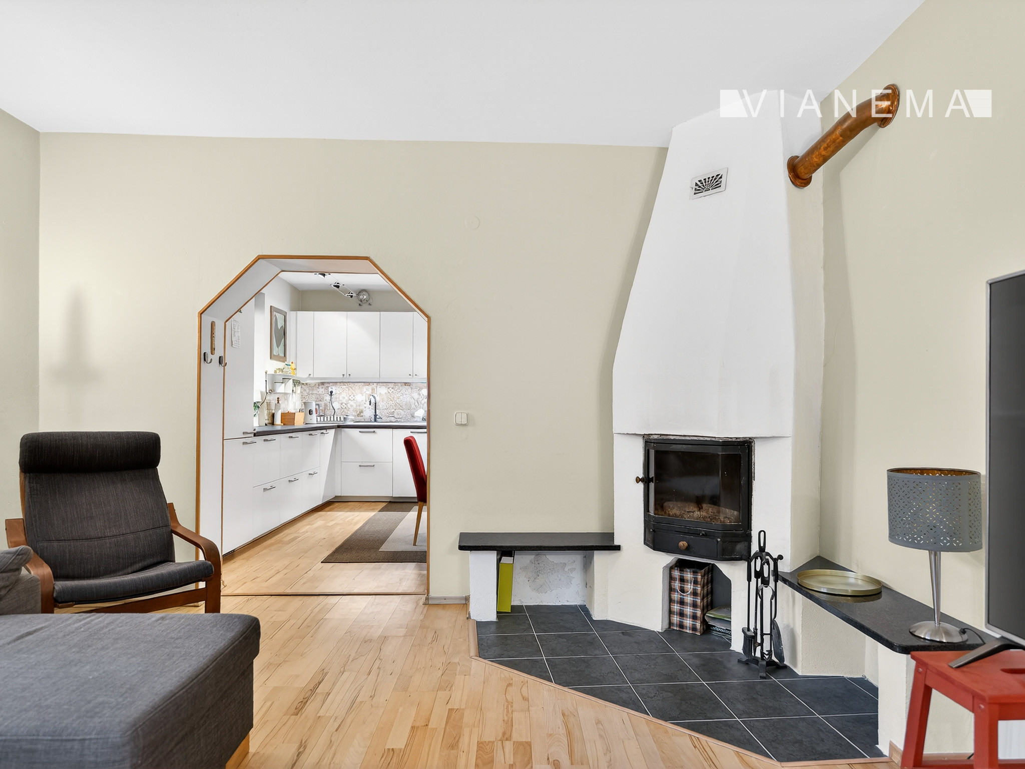 Útulná obývacia izba s krbom, ktorá ponúka príjemnú atmosféru pre rodinné chvíle.
