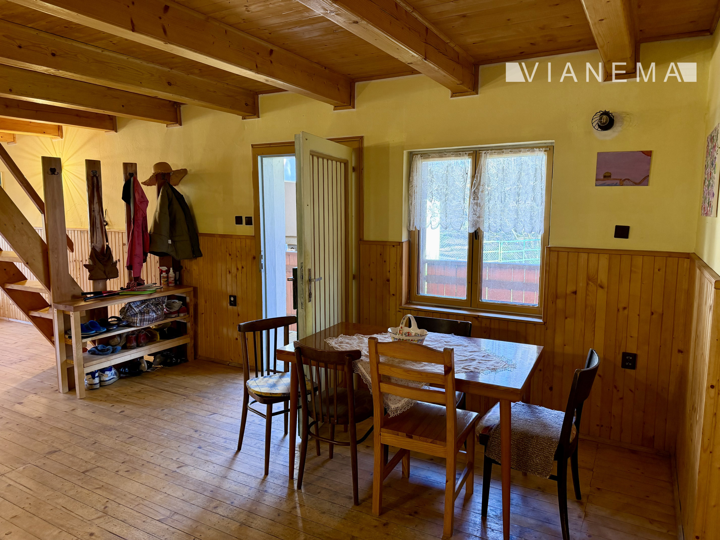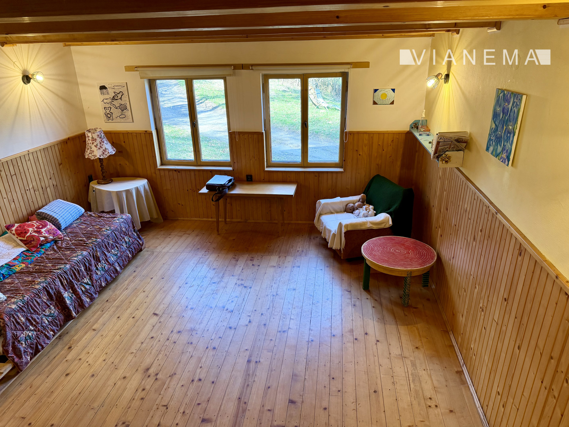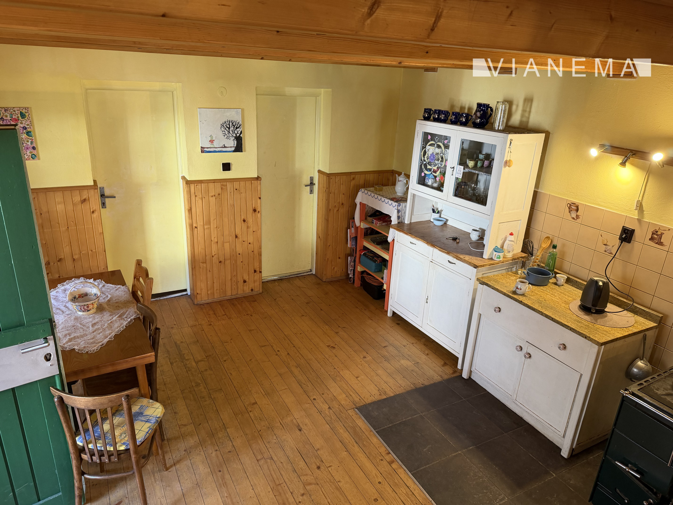 • priestranná obývacia izba s kuchyňou prepojená krbom s prieduchmi do horných 2 podkrovných izieb