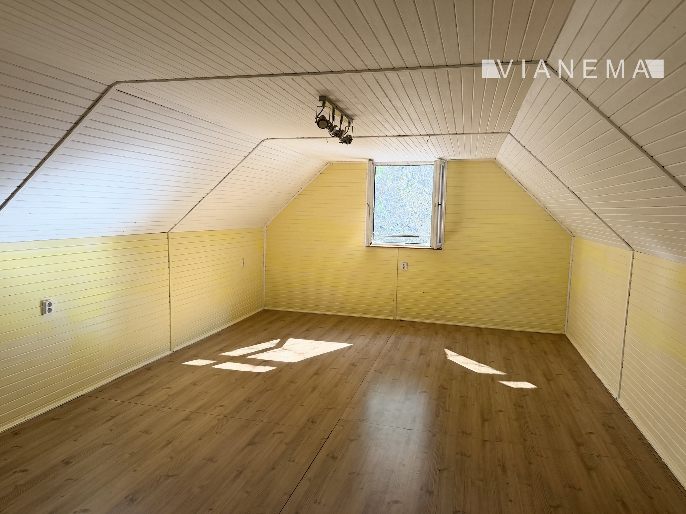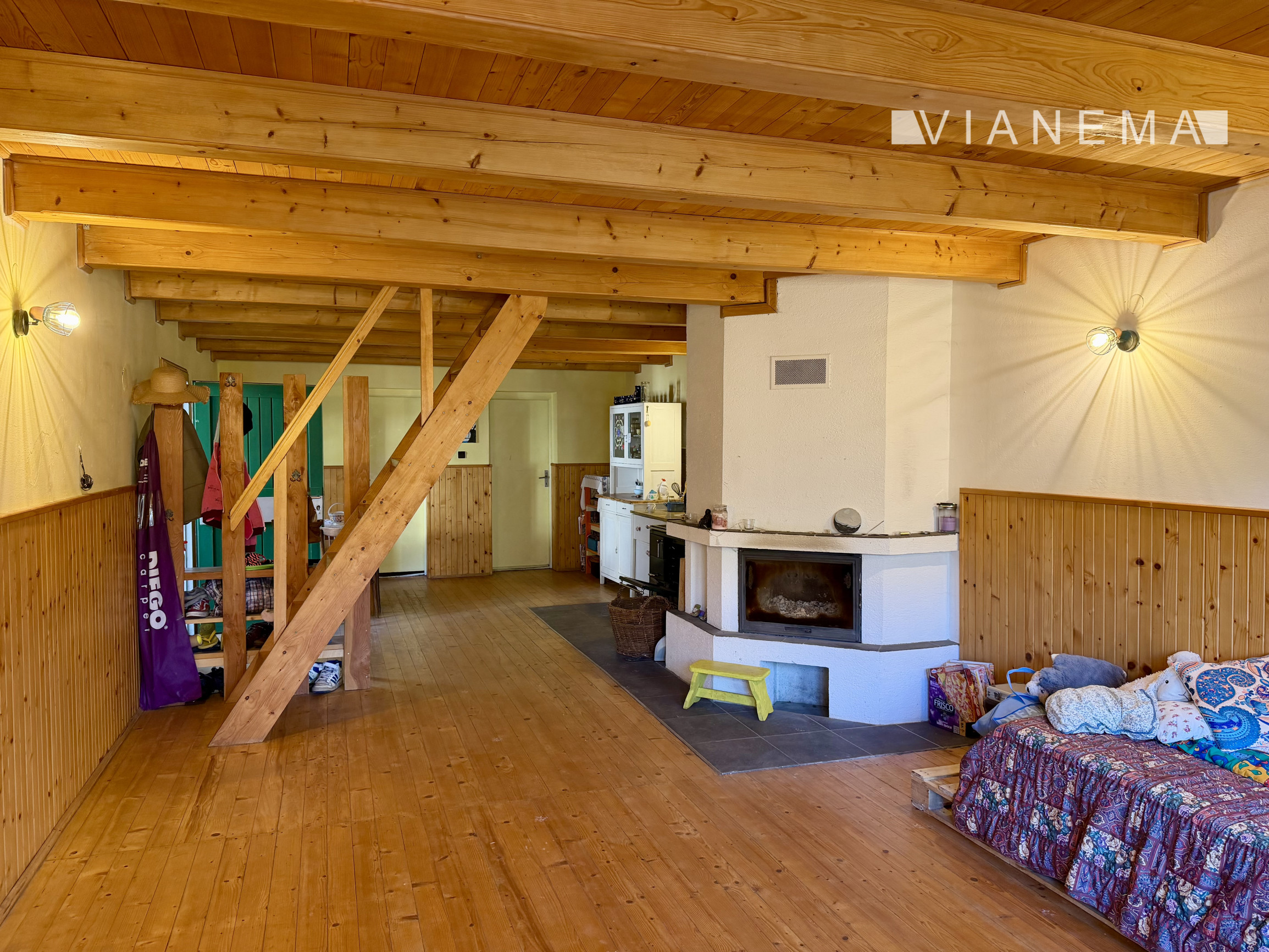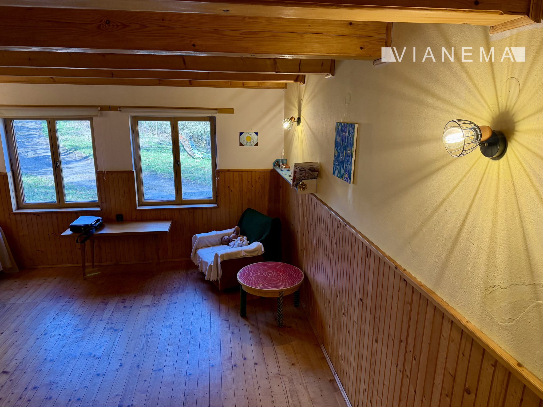 • priestranná obývacia izba s kuchyňou prepojená krbom s prieduchmi do horných 2 podkrovných izieb