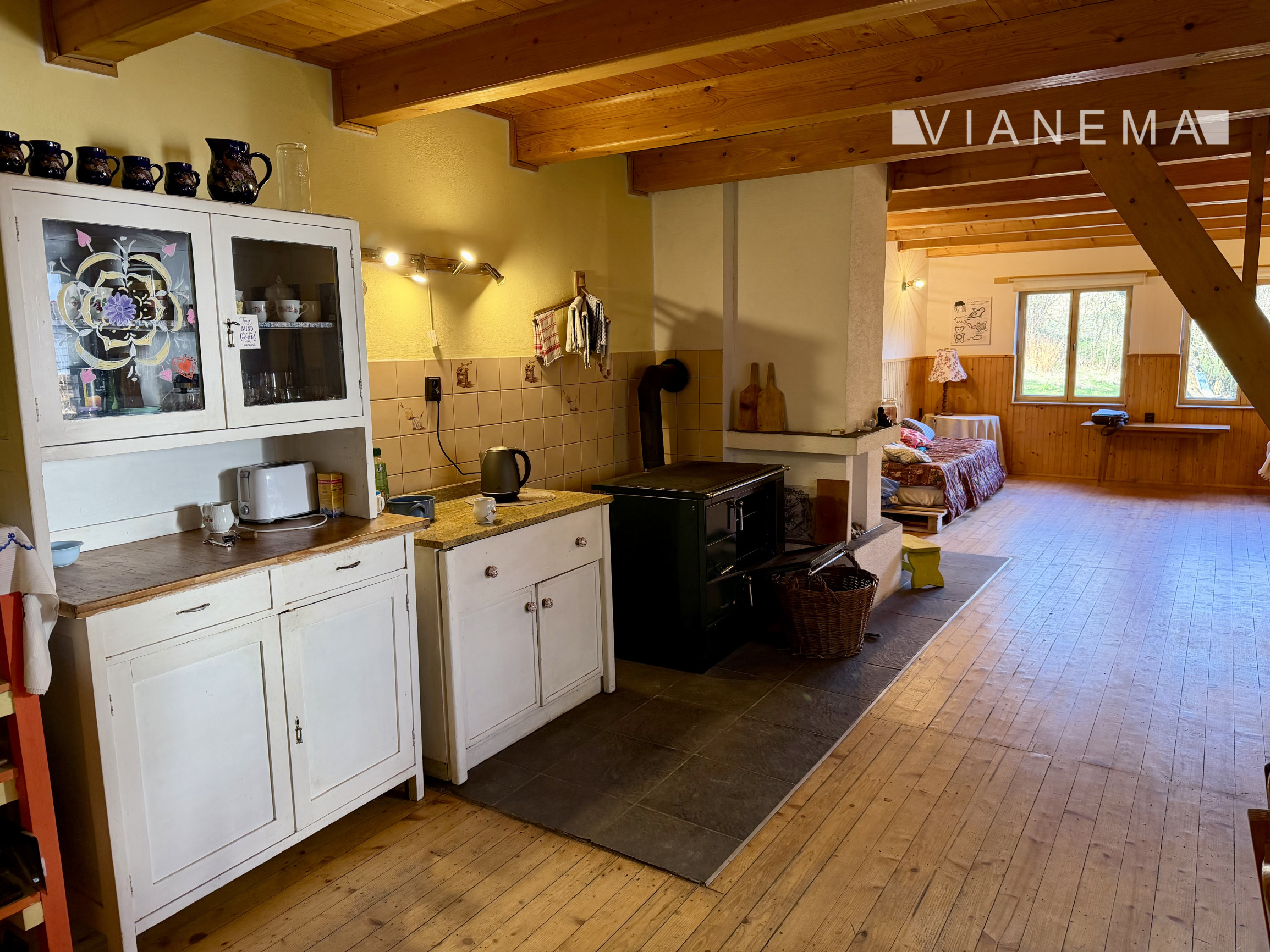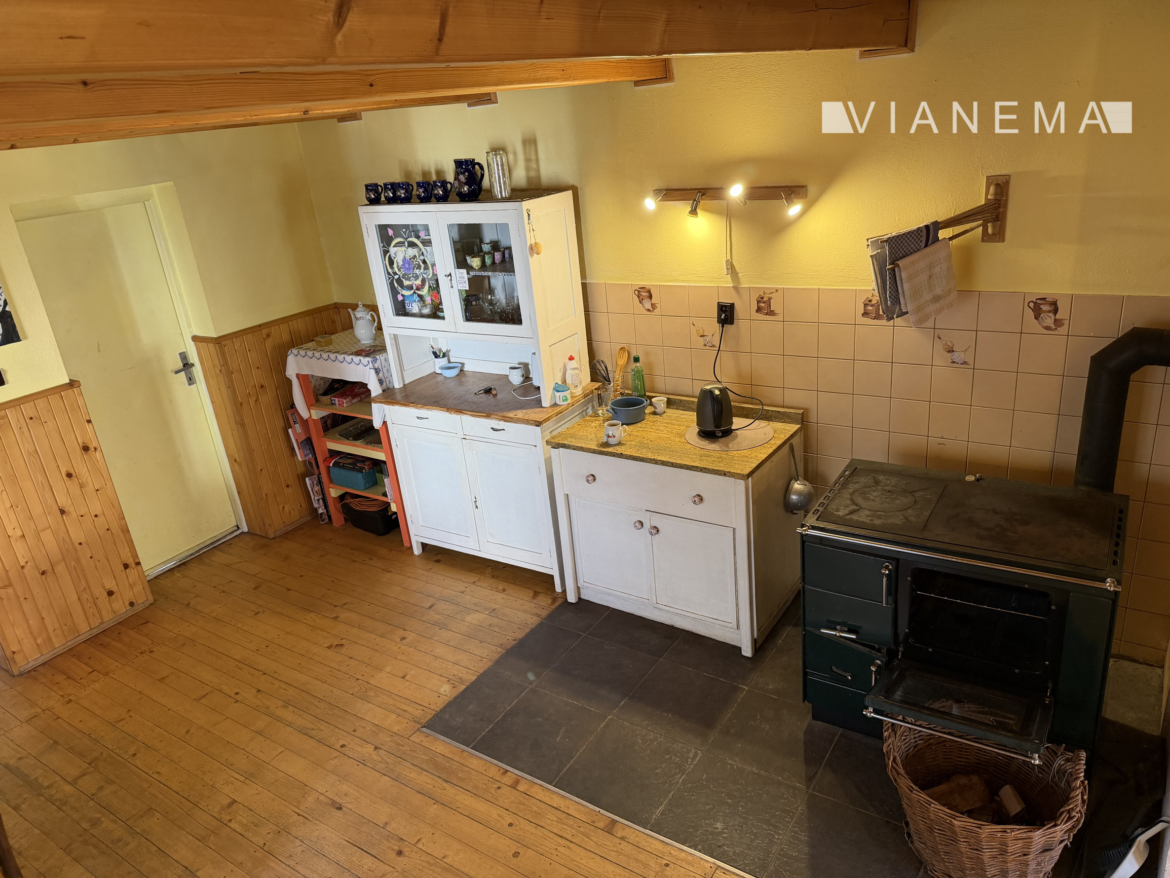 Vykurovanie je zabezpečené krbom a pecou so sporákom v kuchyni, ktorá pohodlne vykúri spodné podlažie.
